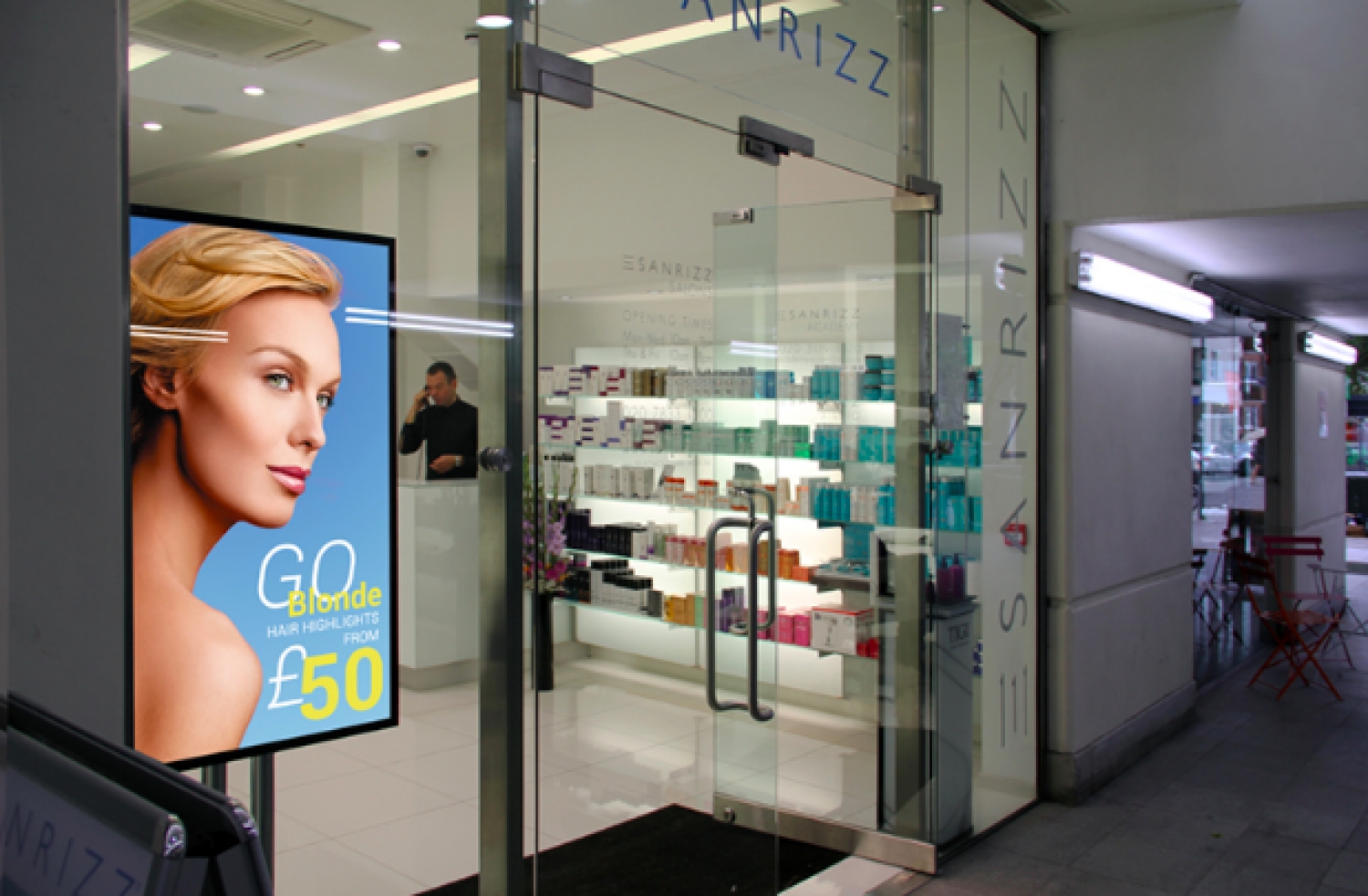 Μελέτη εσωτερικού χώρου και εγκατάσταση οθονών υψηλής ευκρίνειας, φωτεινότητας και αναλύσεων σε βιτρίνες καταστημάτων καθώς και προβολή ψηφιακών μηνυμάτων εξαιρετικά δυναμικών από πλευράς κίνησης και χρωμάτων, προκαλώντας την προσοχή και το ενδιαφέρον των πελατών για την είσοδό τους στο κατάστημα.